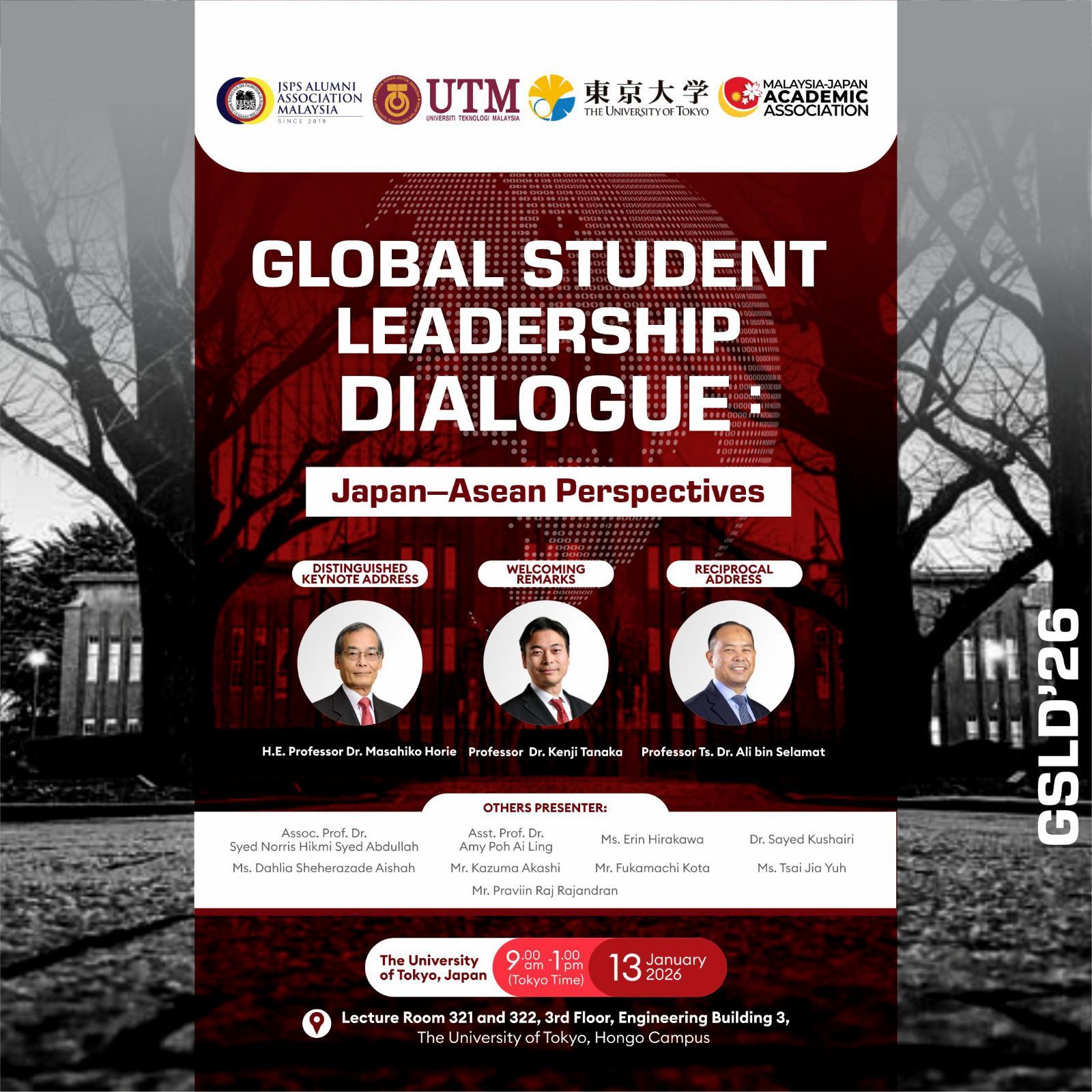 Date: 13 January 2026 (Tuesday) Time: 8:30 a.m. – 1:30 p.m. (Tokyo Time) Venue: Lecture Rooms 321 & 322, 3rd Floor, Engineering Building 3, Hongo Campus, The University of Tokyo