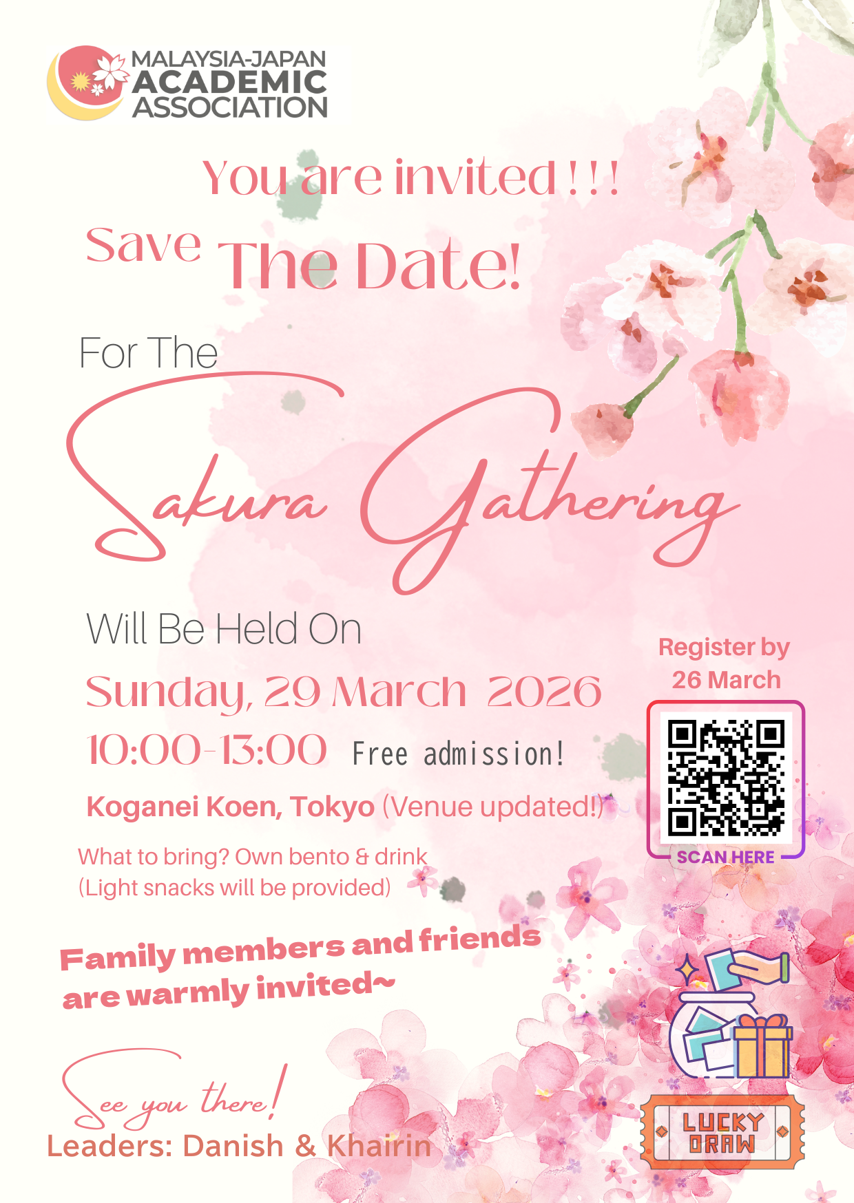 Sakura Gathering 2026 merupakan sebuah inisiatif komuniti yang khusus dianjurkan buat ahli Persatuan Akademik Malaysia–Jepun (MJAA) untuk bersama-sama meraikan keindahan musim bunga. Penganjuran ini bertujuan untuk memperkukuh ukhuwah dan jalinan silaturahim dalam kalangan warga MJAA menerusi pengalaman hanami yang santai dan inklusif.
